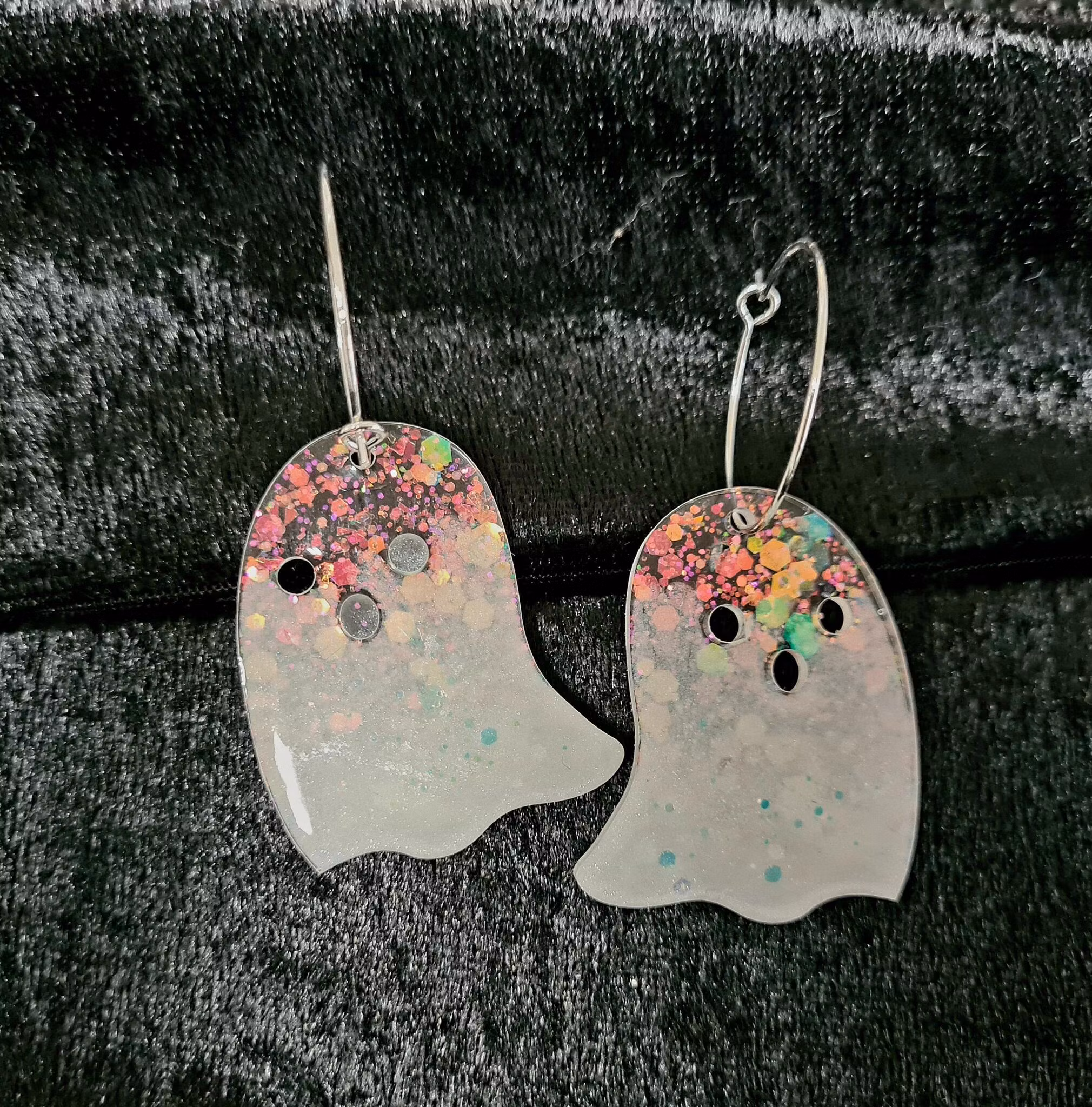 Örhänge Spöken II I lager. 40 kr LÄGG I KORGEN Material: Epoxy, örkrok i silver färg, glitter & pulverfärgHantverkare: Angelina, Amanda & Ella